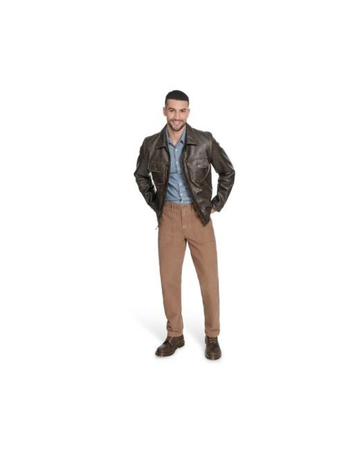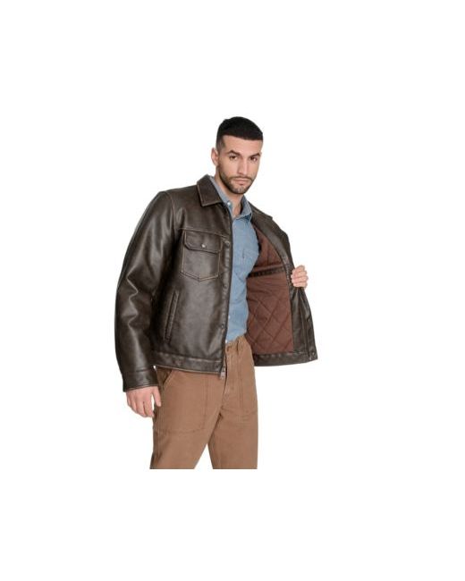 Upgrade your outerwear with this sleek and versatile faux leather trucker jacket. Designed with a timeless silhouette, it features a smooth black faux leather exterior that offers the look and feel of genuine leather-without the upkeep. The classic trucker design includes a button-front closure, two chest pockets with button flaps, and side hand pockets for everyday convenience. The jacket is lined with a quilted interior, providing extra insulation for cooler days without adding bulk. The structured collar can be styled up or down, making this jacket a versatile staple for any wardrobe.