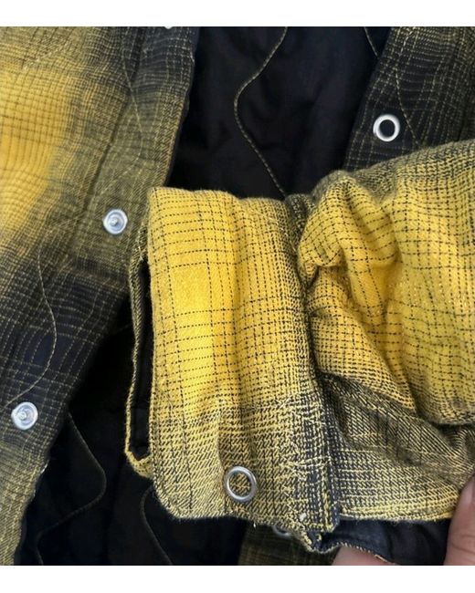 New, Never worn but without tags. Fucking Awesome Lightweight Reversible Flannel Jacket in Yellow and Black. A two-in-one design made from 100% cotton with a custom shadow plaid profile and a cursive logo quilted shell, this reversible Fucking Awesome jacket is tailored to a regular fitting. Side A features a black and yellow flannel body with a full length snap popper fastening, a curved hemline, adjustable cuffs and a classic stand collar, whilst the quilted profile is designed with an insulated construction and embroidered ‘Fucking Awesome’ branding. Both sides feature two front pockets and a single left chest pocket, whilst a woven flag label is sewn across the seam of the plaid-side pocket.