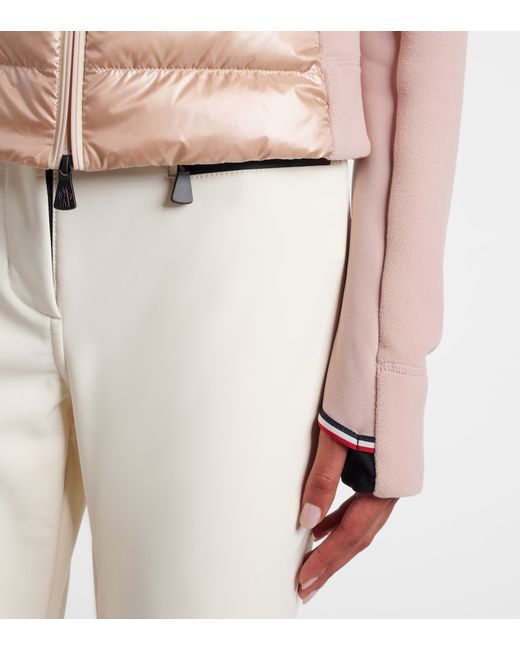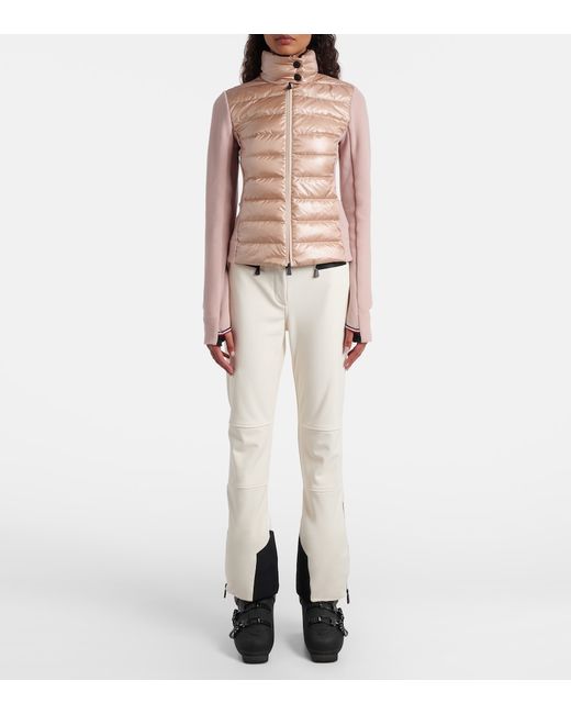 Material: 93% polyester, 7% elastane. Care instructions: hand wash. Made in Romania. Designer color name: 515. Item color: pink. Material II: 100% polyamide. Material III: 93% polyester, 7% elastane. Material IV: 75% polyamide, 25% elastane. Filling: 100% polyester. Filling II: 90% down, 10% goose feathers. Contains non-textile parts of animal origin. Sleeve thumb holes. Pockets: zipped pockets. Closure: two-way zipped front, snap-buttoned fastenings.