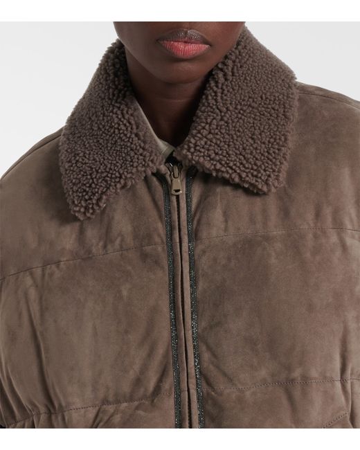 Care instructions: specialist clean. Made in Italy. Designer color name: Mud. Item color: gray. Trim: 100% shearling. Separate lining slip: 100% polyamide. Filling: 100% polyamide. Filling II: 90% down, 10% feathers. Lining: 100% nylon. Insert: 100% brass. Contains non-textile parts of animal origin. Closure: two-way zipped front. Collar: classic (Straight point). Pockets: slant pockets. Cuff: elasticated. Drawstring at the hem for adjustable fit. Leather.