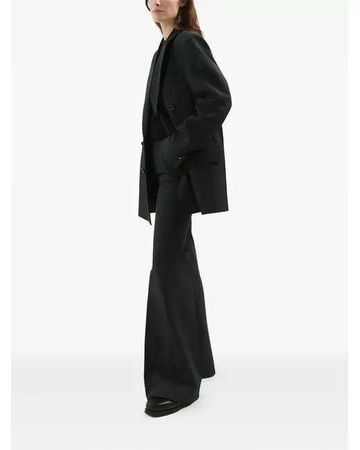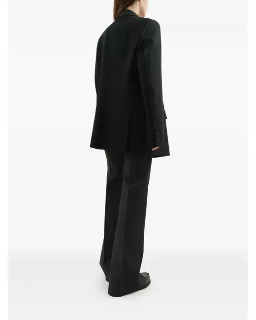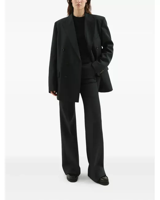 black double-breasted button fastening peak lapels flap pockets buttoned cuffs