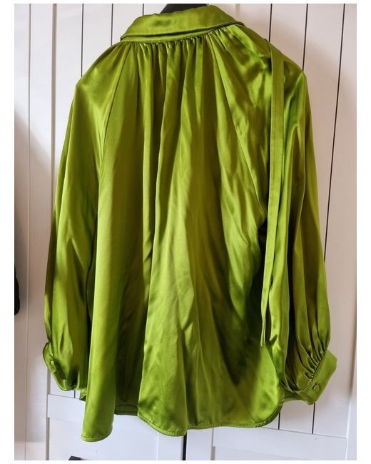 This Max Mara Women's Green Silk Blouse in size 12 is brand new with tags. The blouse features long sleeves, a loose fit, and is made of luxurious silk. It is a stylish and elegant top perfect for the Autumn season, adding a touch of sophistication to any outfit. The classic green colour and quality brand make it a versatile and timeless piece for a woman's wardrobe.
