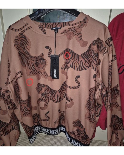 JUST CAVALLI Tiger Pattern Top BNWT Size L Brown tiger pattern smart top from Just Cavalli featuring a round neck with welt finish, relaxed shape, an elasticated hem, long sleeves and elasticated cuffs. Please note this item is brand new but I do want to point out that i noticed a couple of miniscule 'pulls' as shown in the last photo. I originally didn't even notice these- it was only when I was putting it away that it caught my eye. id say around 3/4 but barely noticeable at all.