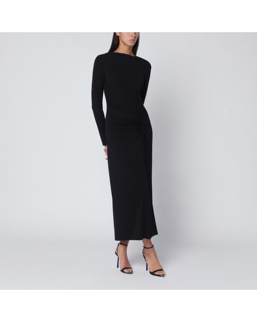 Simkhai midi dress in black jersey, featuring long sleeves and draped front.