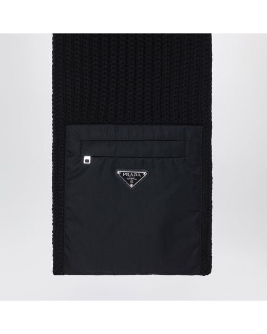 Prada scarf in black virgin wool, characterized by a ribbed pattern, Re-Nylon pocket, and enamelled metal logo triangle.