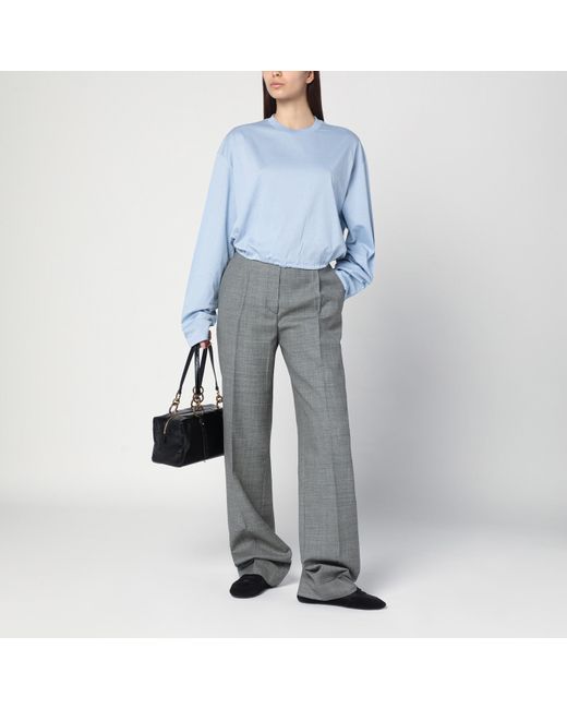 Prada cotton light blue sweater, characterized by long sleeves, ribbed crew neck, fabric logo triangle with logo label on the back, elasticized hem with drawstring and oversized fit.