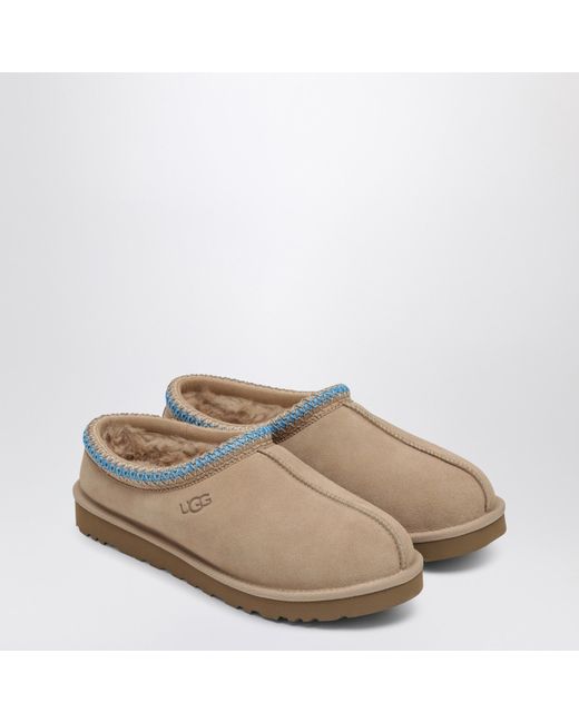 Sand-coloured suede slipper from UGG featuring sheepskin lining, round toe, blue embroidery on the edge and rubber sole.