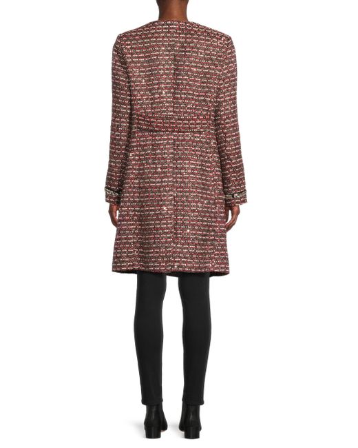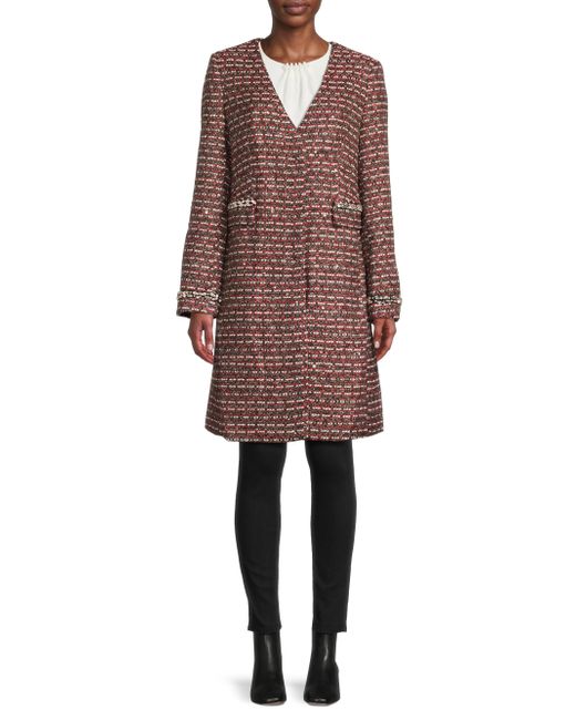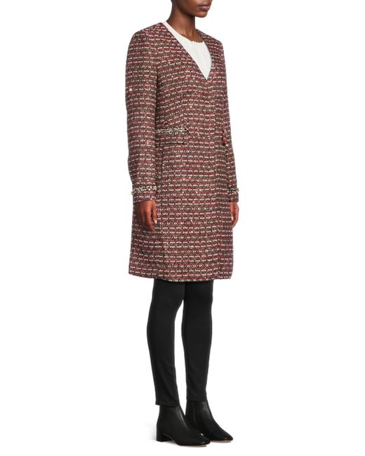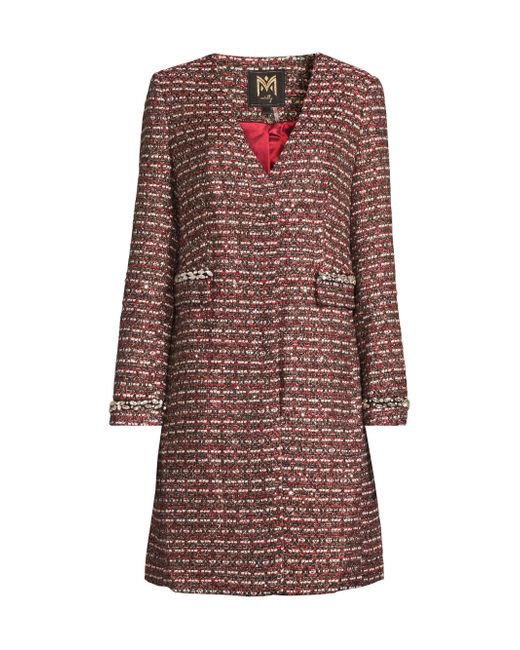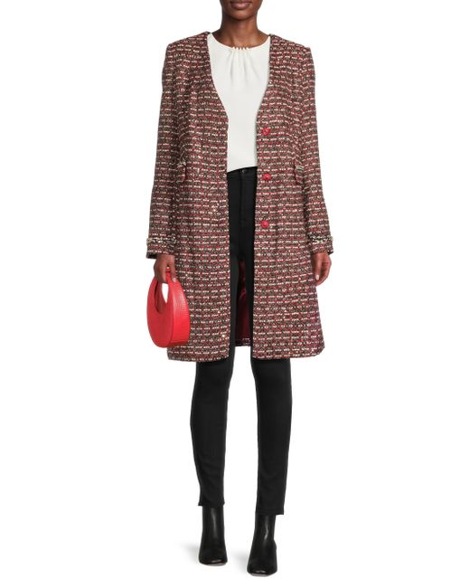 This collarless tweed coat from Milly is styled with V-neckline, showcasing sparkling faux-crystal embellishments at the pockets and cuffs. V-Neck Long sleeves Side seam pockets Front snap closure 90% polyester/4% metallized fibers/2% viscose/2% cotton/1% acrylic/1% polyamide Dry clean Imported SIZE & FIT About 38" from shoulder to hem Model measurements: 5'10" tall Model is wearing a US size Small. Outerwear And Swimwear - Wool > Milly > Saks Fifth Avenue. Milly. Color: Red Tweed. Size: XS.