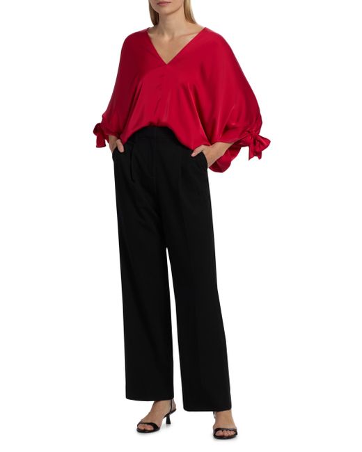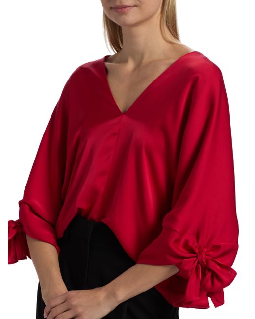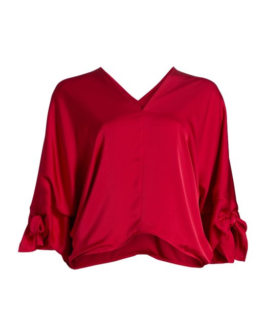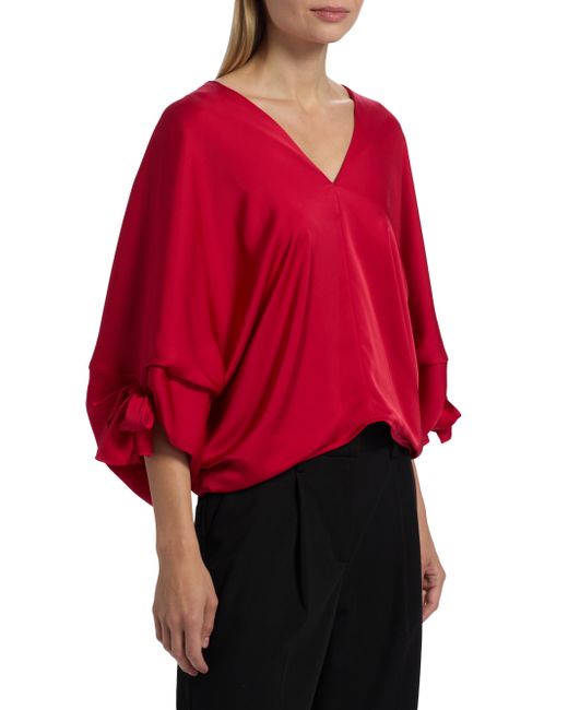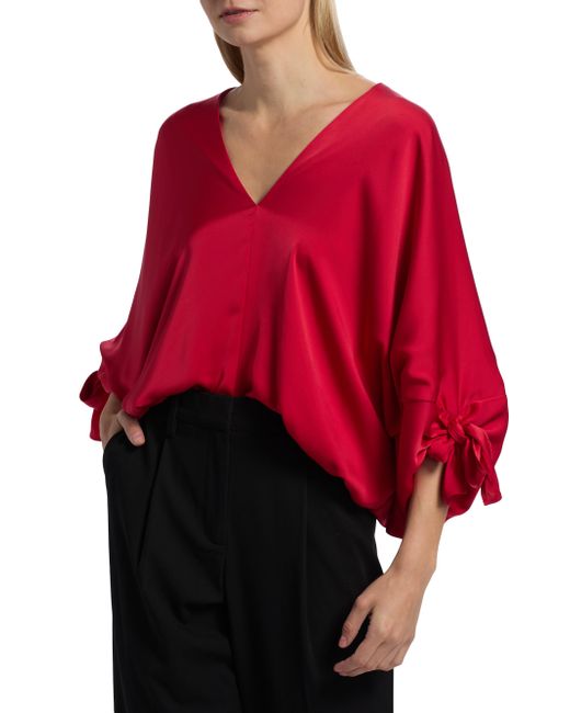 This roomy Krista top from Ramy Brook, crafted of lustrous satin, features a V-neck and three-quarter-length dolman sleeves with tie cuffs. V-neck and V'd back Three-quarter-length dolman sleeves, tie cuffs Pulls over 100% polyester Dry clean Imported SIZE & FIT About 25" from shoulder to hem Model measurements: 5'10" tall Model is wearing a US size Small. Contemporary Sportswear - Contemporary Collections > Ramy Brook > Saks Fifth Avenue. Ramy Brook. Color: Scarlet Red. Size: XS.