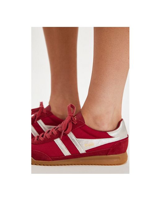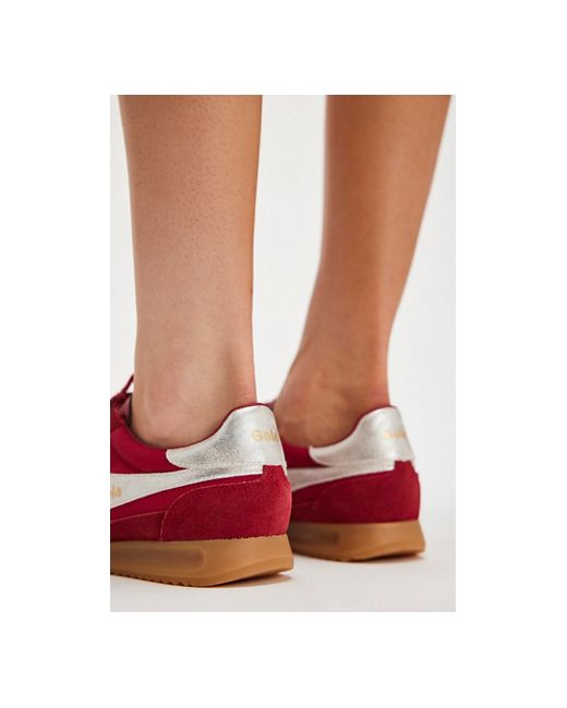 Retro and sporty, this soccer-inspired pair from Gola features heavy-weave nylon uppers and suede and leather overlays, complete with a gum wedge sole for some cool contrast. **Features:** Low-top style, heavy-weave nylon uppers, suede overlays, contrast leather stripes and heel tab, wedge gum rubber sole **Why We Gola Tornado Trainers Shoe at Free People in Red/Silver, Size: US 8.5