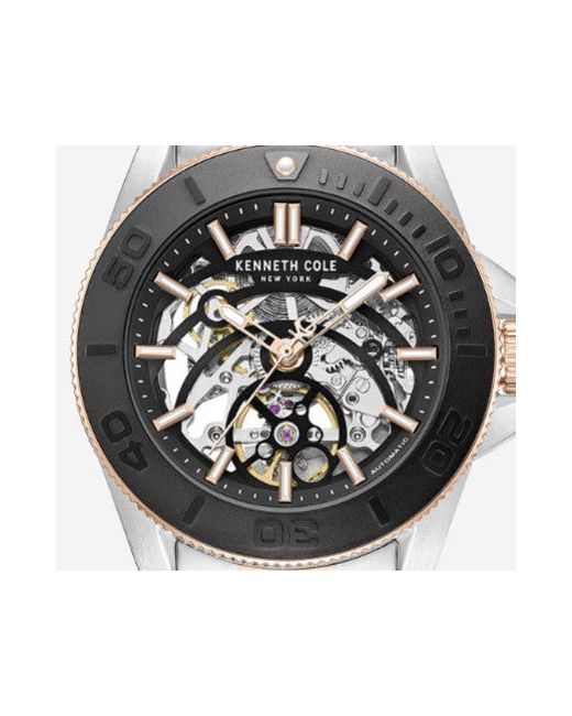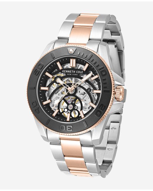 WHAT’S IN IT FOR YOU? Automatic watch Round case with black top ring Skeleton dial Rose gold hour markers Automatic movement Self-winding Two-tone adjustable bracelet strap 5ATM water resistance Imported | Kenneth Cole | Skeleton Automatic Black Contrast Dial Two Tone Bracelet Watch in TT SILVER/ROSE GOLD
