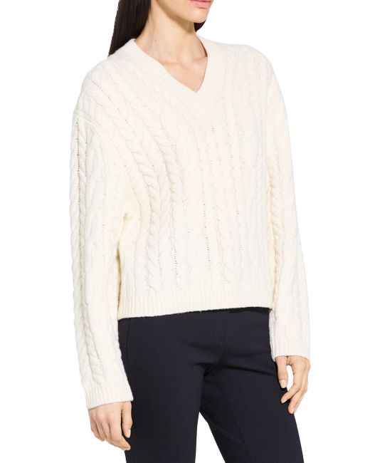 Theory's sweater is made of soft wool and cashmere, showcasing a classic cable-knit design with a refined V-neck and ribbed hem. Made with responsibly sourced wool V-neck Long sleeves Rib-knit trim Pulls over 90% responsibly sourced wool/10% cashmere Dry clean Imported SIZE & FIT About 23" from shoulder to hem Model measurements: 5'10" tall Model is wearing a US size Small ABOUT THE BRAND In 2000, founders Andrew Rosen and Elie Tahari launched Theory with a focus on innovative, comfortable stretch pants for women. Since then, the New York-based brand has become well-known for its mastery of polished, well-tailored separates for women and men. Contemporary Sportswear - Theory Sportswear > Theory > Saks Fifth Avenue. Theory. Color: Ivory. Size: XS.