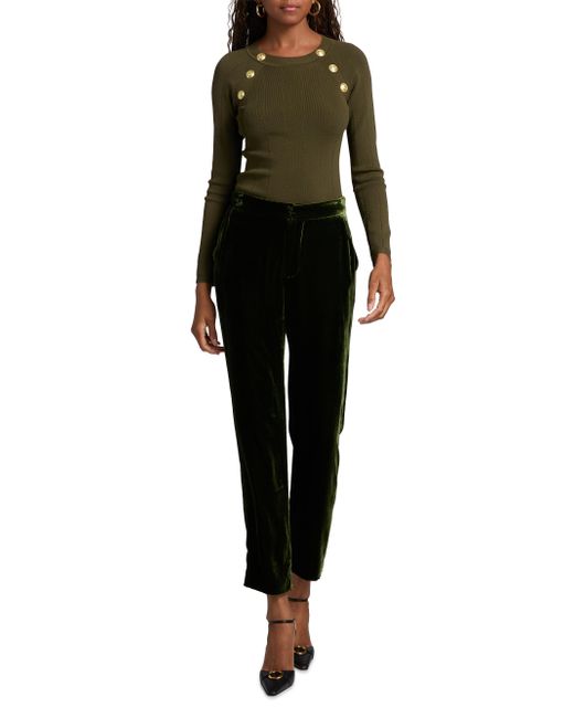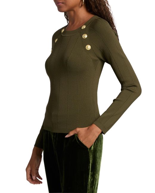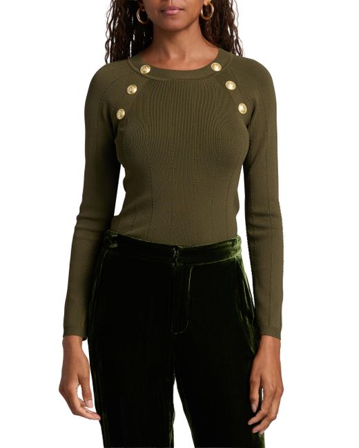 Crafted of a fine-gauge textured rib-knit, the Gretchen sweater from L'AGENCE is adorned with goldtone crest buttons at the shoulders. Crewneck Long sleeves Pulls over 55% rayon/43% nylon/2% spandex Lining: 100% polyester Dry clean Imported SIZE & FIT About 21.75" from shoulder to hem Model measurements: 5'10" tall Model is wearing a US size Small ABOUT THE BRAND Founded in 2008, L'Agence marries Southern California ease with chic Parisian style. Using luxurious fabrics, the Los Angeles-based label delivers feminine collections that are both timeless and versatile. In 2015, the label launched a denim line in a range of sleek, impeccably tailored cuts. Contemporary Sportswear - Workshop > L'agence > Saks Fifth Avenue. L'AGENCE. Color: Deep Olive Gold. Size: XS.
