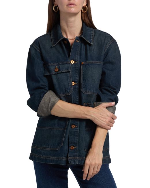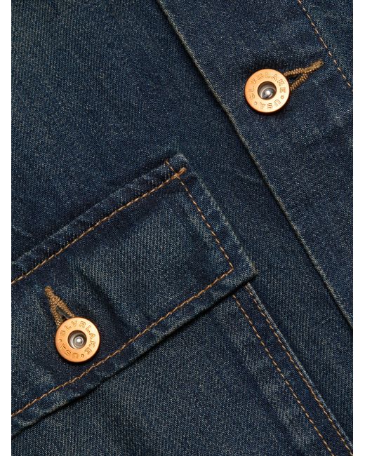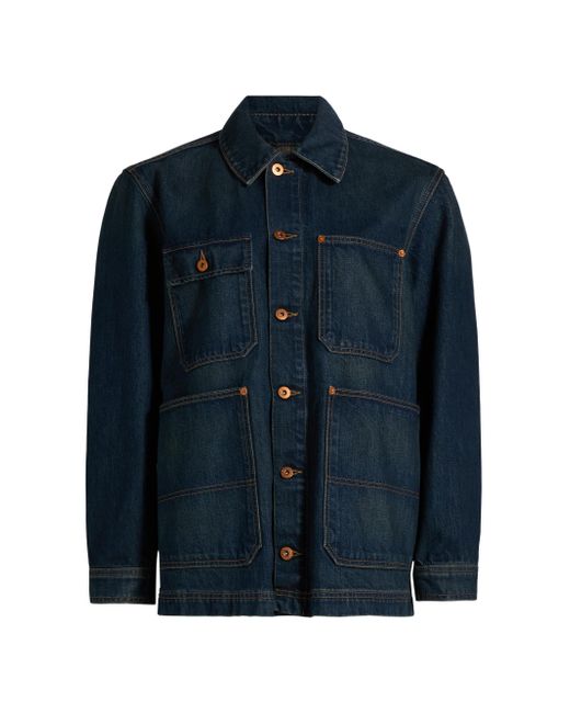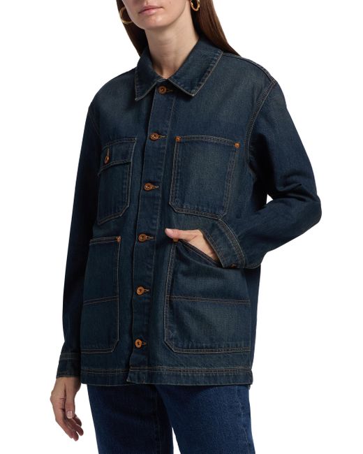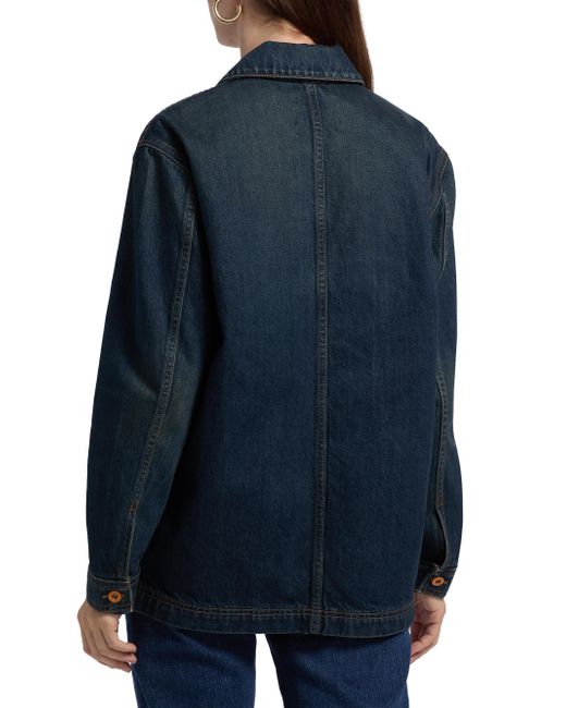 Crafted of dark-wash denim, this Worker jacket from SLVRLAKE features a spread collar, a streamlined silhouette, and four front pockets. Spread collar Long sleeves, button cuffs Chest button-through patch pocket Chest and side patch pockets Button-front closure 100% cotton Trim: metal buttons Machine wash Made in USA of Italian fabric SIZE & FIT Oversized fit About 29" from shoulder to hem Model measurements: 5'10" tall Model is wearing a US size Small. Contemporary Sportswear - Denim And Bottoms > Slvrlake > Saks Fifth Avenue. SLVRLAKE. Color: Shakey Ground. Size: XS.