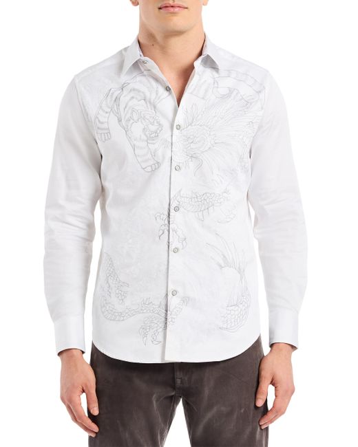Crafted of cotton, the Maelstorm shirt from Robert Graham features a striking embroidered design of a silver tiger and a fierce dragon on a tonal wave-patterned background. Contrast print at the collar and cuffs completes the design. Spread collar Long sleeves, button cuffs Button-front closure 100% cotton Machine wash Imported SIZE & FIT Model measurements: 6'2" tall, 40" chest, 31" waist Model is wearing a US size Medium. Mens Modern Coll & Outer - Contemp Classic Collecti > Robert Graham > Saks Fifth Avenue. Robert Graham. Color: White. Size: Small.