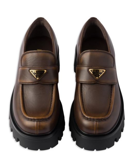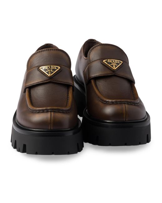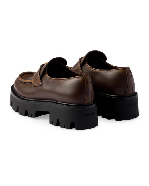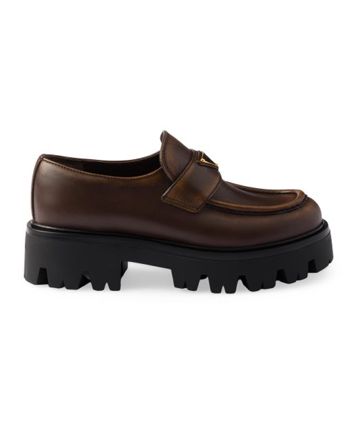 Enameled metal triangle logo Monoblock rubber sole, 50 mm / 1.9'', with hot-stamped logo Imported 100% Calf leather. Lsd Rtw - Prada Rtw > Prada > Saks Fifth Avenue. Prada. Color: Brown. Size: 7.
