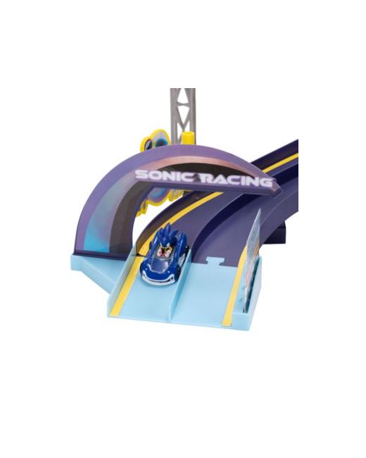 Race into action with the Sonic E-Stadium Track Set. This gravity-fed die-cast track delivers fast-paced fun with thrilling turns and fun obstacles-just like the E-Stadium course in the Sonic Racing: Cross Worlds video game. So, you're ready to recreate your favorite racing moments straight out of the game.