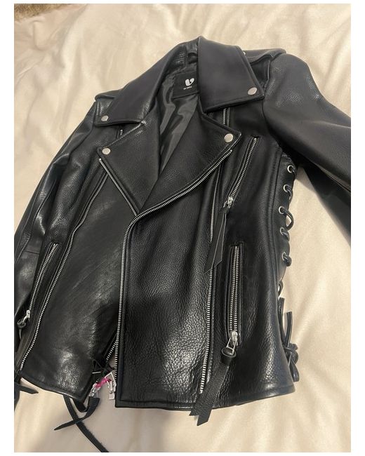 The sides are laced with leather thongs. The heaviness of the jacket is shown by the weight of it. It was bought for £280. The back has a padded designed bottom. Studded down epaulettes. Zipped cuffs and pockets.