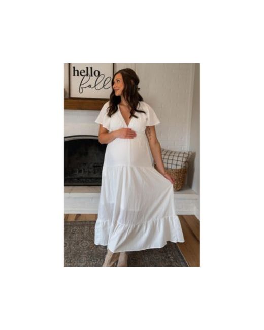 Embrace effortless elegance with our Ivory Deep V-Neck Flutter Sleeve Tiered Maternity Midi Dress. Designed for comfort and style at every stage, this dress features a flattering deep V-neckline and romantic flutter sleeves that create a beautiful silhouette. The tiered skirt gracefully drapes over your bump, providing plenty of room to grow while offering a chic, airy feel. Soft, lightweight fabric ensures all-day comfort, making it perfect for baby showers, special occasions, or everyday wear. Pair with sandals for a casual look or dress it up with heels. Maternity style meets timeless sophistication!