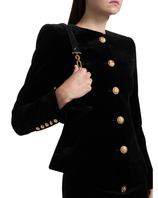 ONLY AT SAKS. In a departure from seasons prior, Olivier Rousteing signals a new era for Balmain, swapping the house's signature sharp tailoring for a newfound softness. The focus shifts to slouchy silhouettes, chunky rib-knits, and oversized outerwear, as billowing batwing sleeves and cozy hoods replace the structured shoulder pads of the past. Crafted of Italian cotton velvet, Balmain's tailored jacket features striking goldtone buttons, strong padded shoulders, and a flared, peplum hem. Crewneck Pad shoulders Long sleeves, button cuffs Peplum hem Button-front closure 100% cotton Dry clean Made in Italy SIZE & FIT Model measurements: 5'10" tall Model is wearing a US size 4 ABOUT THE BRAND In 1945, founder Pierre Balmain made his well-received debut of opulent, ultra-feminine designs. Known today for its iconic blazers, impeccably constructed dresses and signature fragrances, the brand continues its dedication to masterful tailoring and elegance under the helm of Creative Director Olivier Rousteing. Advanced Designer - Balmain > Balmain > Saks Fifth Avenue. Balmain. Color: Noir. Size: 2.