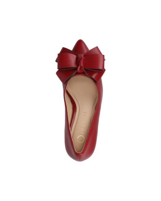 A classic look that's proof bows are always in style, the Crystol by Journee. This slip-on silhouette features a soft velvet fabric upper finished with a bow accent at the toe. A bold stiletto heel and a padded insole elevate the look. At Journee, our pump styles will let you go from a fun night out with the girls to kicking back and relaxing at the end of the night without any trouble. Also available in wide width.