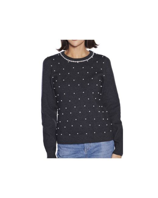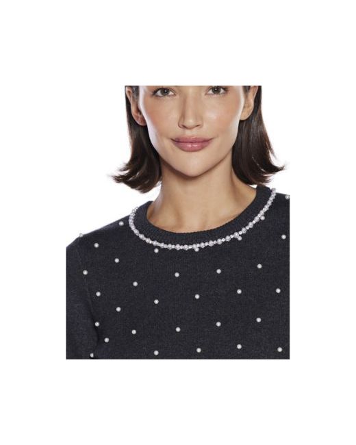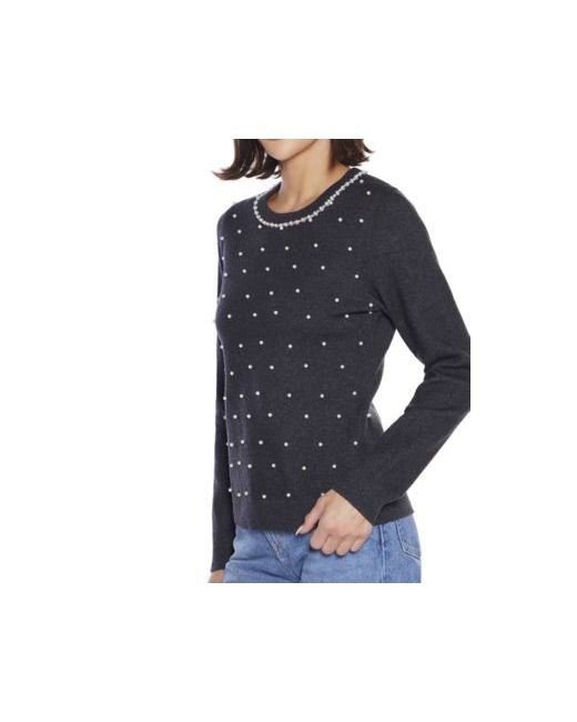 Featuring a rhinestone chain at the front neckline, this double-knit long sleeve sweater adds fun, sparkly vibes with faux cultivated pearl rivets scattered across the front.
