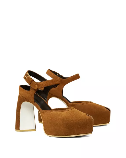 brown suede upper peep toe platform sole buckle fastening ankle strap