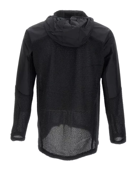 black fleece inserts zip pocket hooded neckline front zip closure logo
