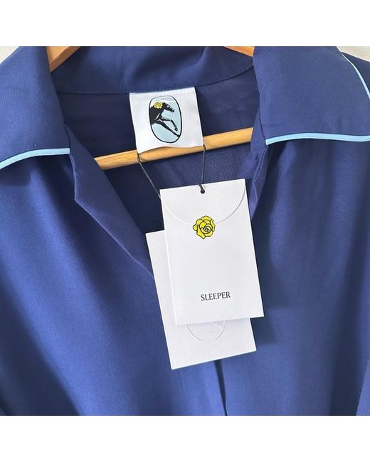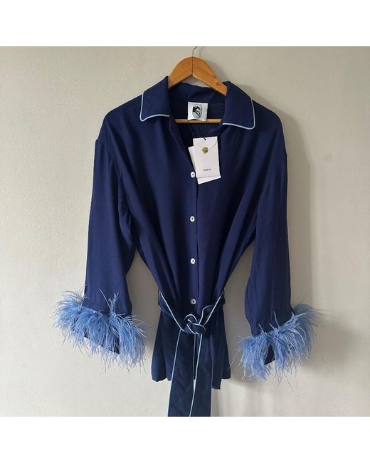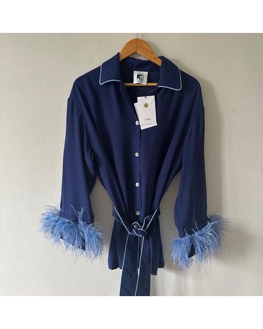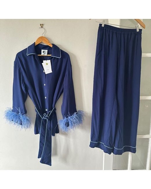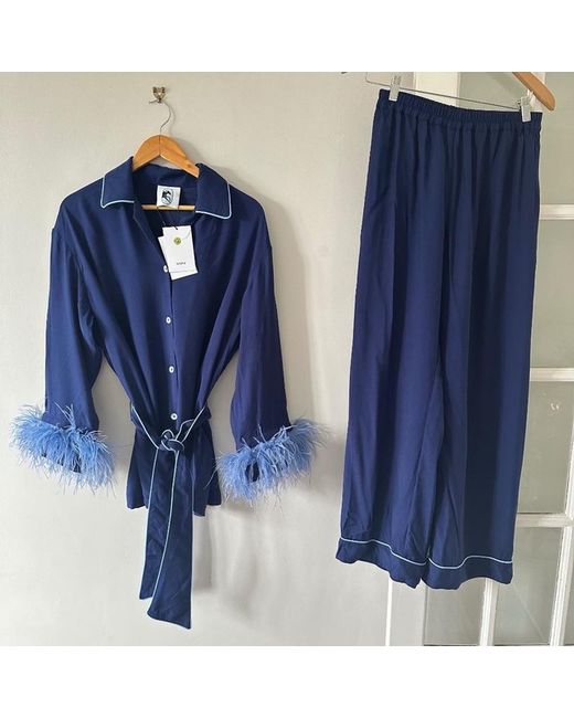 Sleeper Miss Cat PJS RRP £472 Size small Brand new with tags this set strikes the perfect balance between vintage glamour and contemporary ease. Cut from silky viscose fabroc 2 piece edit is framed by contrast piping and features detached feather cuffs for a custom look A waist defining belt for the shirt and an elastic waistband on the pants ensure a comfortable fit perfect for lounging at home or heading out for brunch high rise pants designed for a relaxed straight leg fit lightweight, non stretchy fabric Navy blue front button fastening belted waist elasticated waistband contrasting trim Material:Viscose/Polyester/Ostrich Feather/Cotton. Colour: blue.