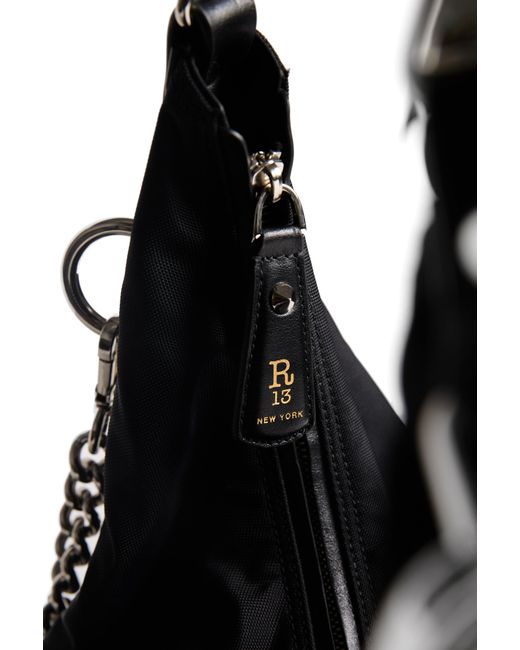 Large nylon hobo bag with harness embellishments, removable leather strap, interior logo pocket and removable chain.