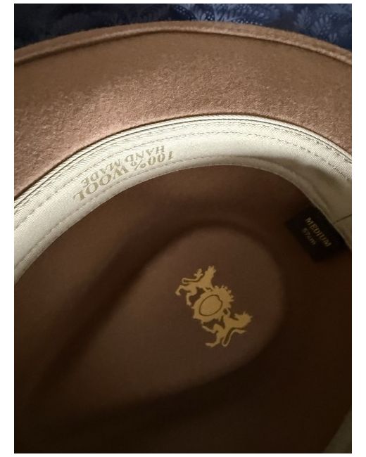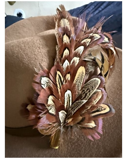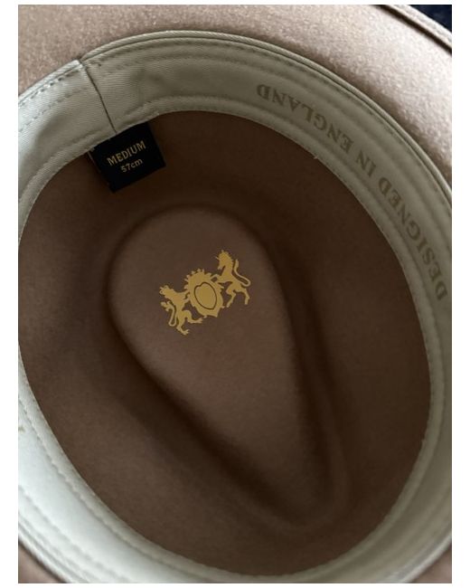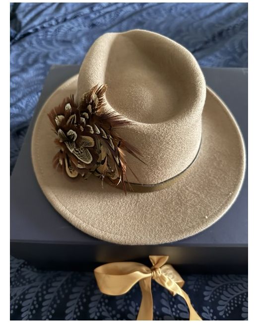 Beige Mackenzie & George fedora with signature feather detail in original box never worn / immaculate condition size medium