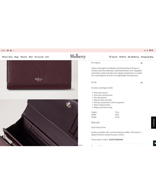This brand new Mulberry medium continental small grain purse in black cherry is a classic and stylish accessory for women. It comes with proof of purchase from Mulberry in July 2025 and is in it's original box complete with branded tissue, gift envelope, and branded gift bag. It would make a perfect Christmas gift. Selling as it was an unwanted gift (I already have one). RRP £345.Made from leather with a small grain pattern, this purse features a zip accent and credit card slots. The compact size of 15 cm length and 11 cm width makes it convenient to carry in your handbag or bag. The elegant black cherry colour adds a touch of sophistication to any outfit, making it a versatile and practical item for everyday use.