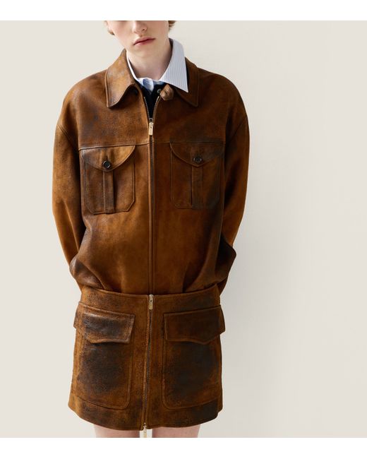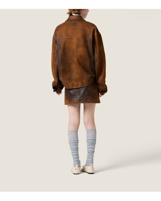 Renowned for its playful subversion, Miu Miu mixes the codes of masculine and feminine dressing with this suede jacket. Shaped with supple calfskin, this piece is crafted with a fine waxing treatment, resulting in a rich, cognac colour that beckons vintage appeal.