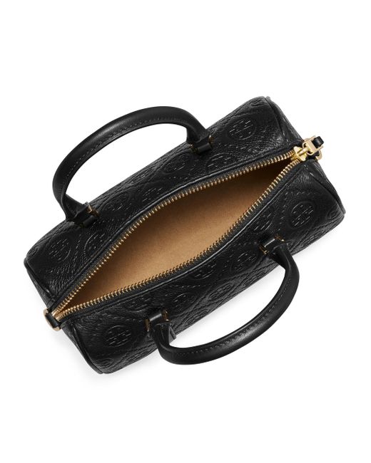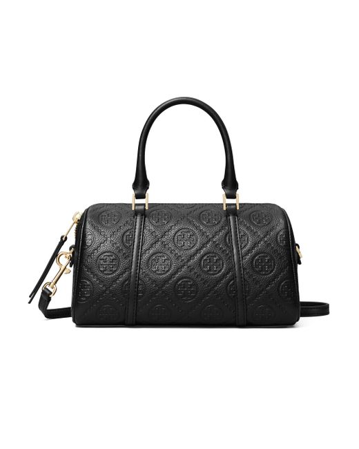 This Tory Burch Mini T Monogram barrel bag is crafted of leather with signature embossing and goldtone hardware. A removable shoulder strap adds versatility to the structured design. Two top handles Removable shoulder strap Interior: one slit pocket Top zip closure Leather Lining: textile Imported SIZE About 8"W x 4.75"H x 3.75"D Shoulder strap: about, 22.2" drop ABOUT THE BRAND Since debuting her brand in 2004, New York-based designer Tory Burch has made an impact on the fashion world with her handbags and shoes, and playful-yet-polished clothing. Today, Burch remains inspired by color and travel, with her vibrant collections bursting with prints, and her instantly recognizable double-T logo drawing from Moroccan architecture. Handbags - Tory Burch Handbags > Tory Burch > Saks Fifth Avenue. Tory Burch. Color: Black.