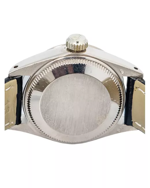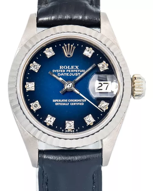 blue dial round case shape 26mm diamond markers date window leather strap fluted bezel automatic movement Condition: EXCELLENT. This previously owned item is in near-perfect condition with no signs of damage or use. Normal everyday use and external agents may reduce the lustre of gemstones and gold surfaces. To maintain, use specific, non-abrasive products specially meant for cleaning jewellery. The original box and papers are not included.