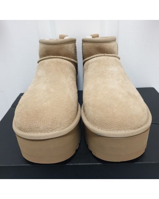 **RED INK CROSSES ON LABELS** These Ugg Platform Boots in size 4 are brand new in a stylish sand/beige colour. With a comfortable ankle shaft style and round toe shape, these boots are perfect for casual occasions in the winter season. Made from soft suede material with a wedge heel and rubber outsole, these Ugg Classic boots feature the iconic logo accent, making them a trendy and practical choice for any woman looking for a chic footwear option.