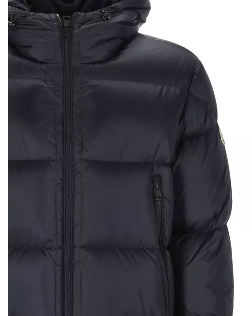 dark blue hooded neckline two-way zip fastening zip pockets quilted design long sleeves