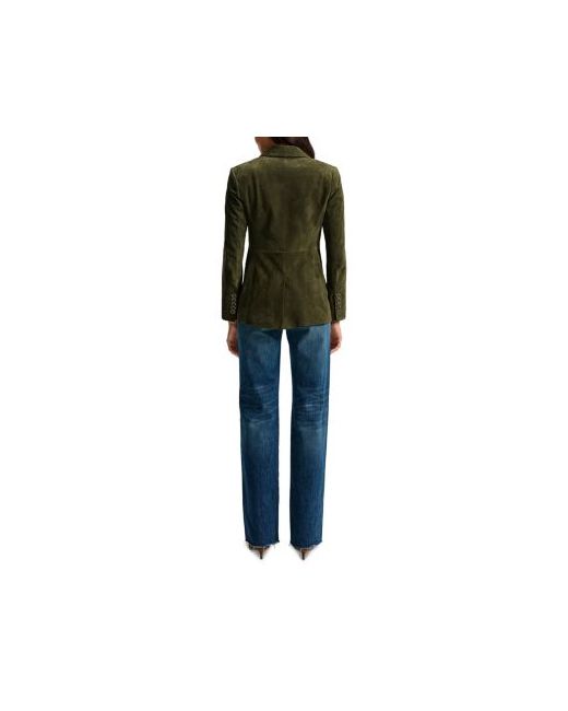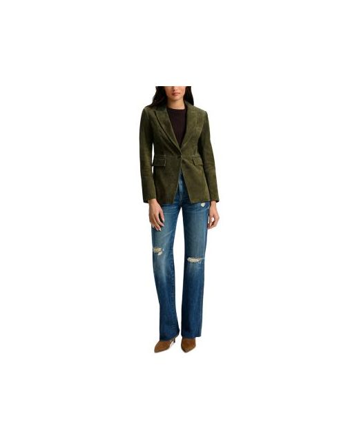 The Duane by Veronica Beard is the classic single-breasted blazer, reimagined in soft, velvety suede. A peak lapel, cutaway hem, and flap pockets complete the look.