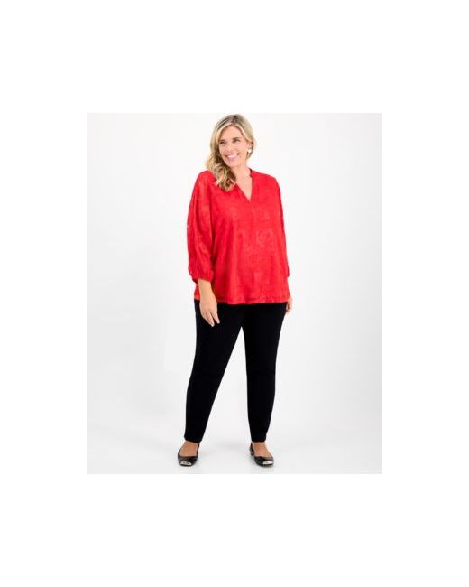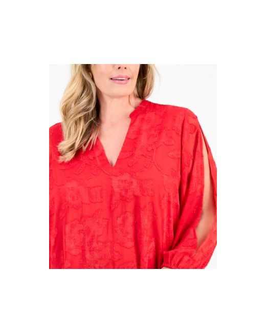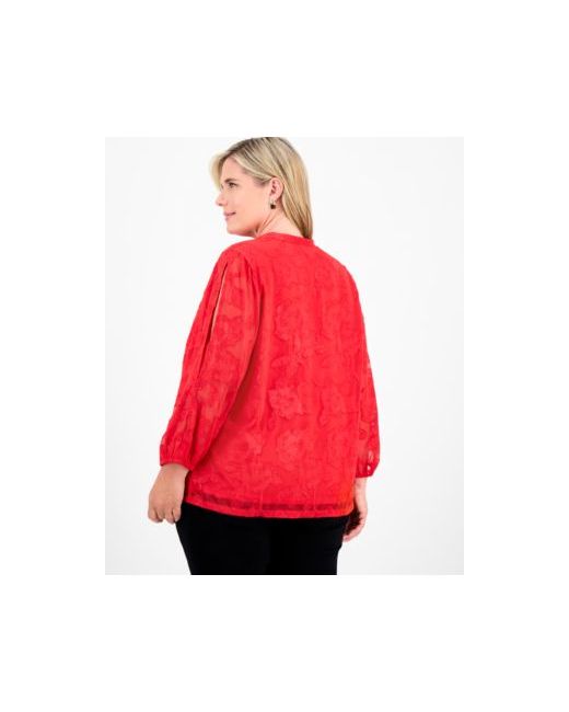 Shimmering with metallic threads woven through the burnout jacquard fabric and framed at the sides with graceful blouson sleeves, Jm Collection's plus size blouse brings a fancier touch to your everyday outfits.