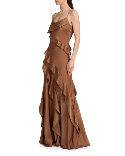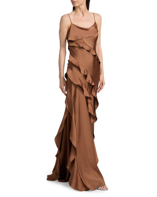 The Ellen slip gown from Amur showcases ruffled detailing and a cowl neckline. Cowl neck Spaghetti straps Side zip closure 100% polyester Dry clean Imported SIZE & FIT About 62.25" from shoulder to hem Model measurements: 5'10" tall Model is wearing a US size Small. Contemporary Sportswear - Contemporary Collections > Amur > Saks Fifth Avenue. Amur. Color: Nutmeg. Size: 0.