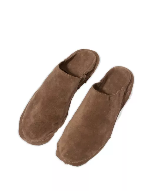 brown suede upper raw-cut edges slip-on style flat sole round toe