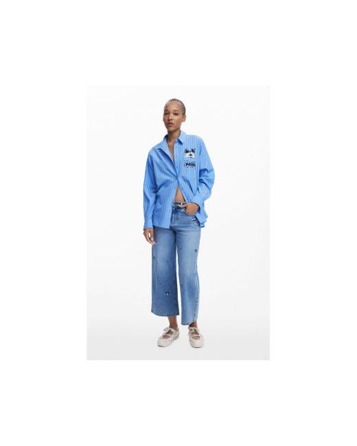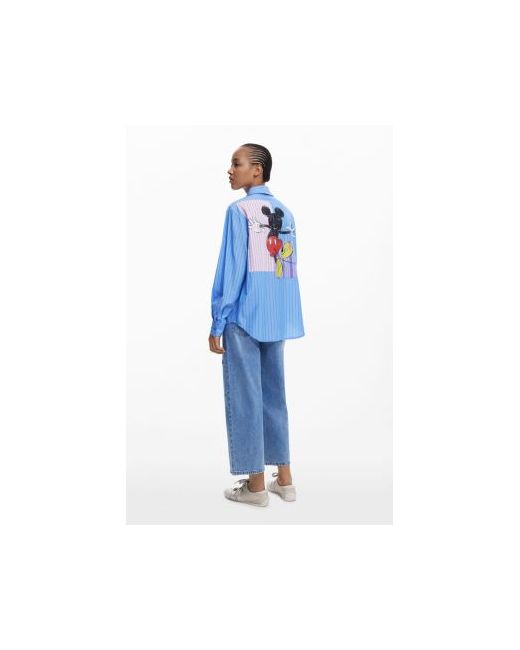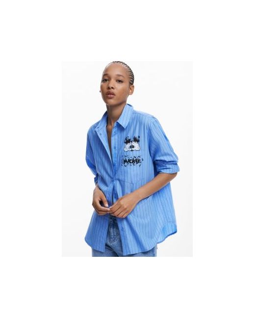 Oversized long-sleeve shirt, front pocket, in blue color with pinstripe and Mickey Mouse print.