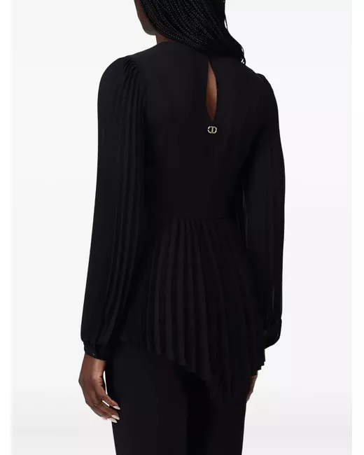 black pleated twist-front design long sleeves round neck gold-tone logo plaque