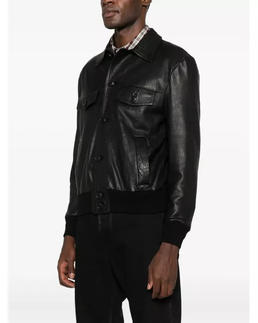 black leather front button fastening two chest flap pockets long sleeves ribbed cuffs and hem