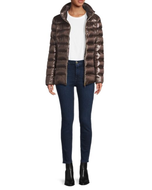 This Iconico Claudia down jacket from Herno features a quilted design, a stand collar, and long sleeves. Stand collar Long sleeves Front zip closure 100% nylon Lining: 100% nylon Trim: 100% wool Fill: 90% down/10% feather Hand wash Imported SIZE & FIT Model measurements: 5'10" tall Model is wearing a US size 4. Outerwear And Swimwear - Down > Herno > Saks Fifth Avenue. Herno. Color: Marrone Scuro. Size: 10.