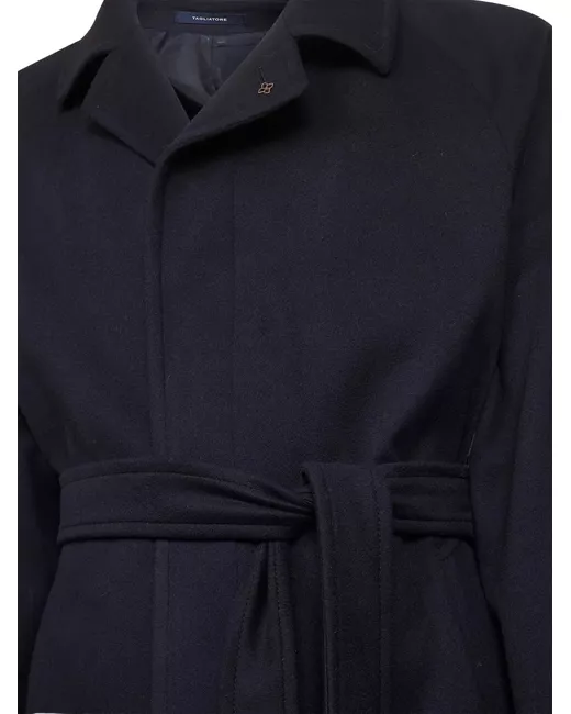 blue lapel collar logo pin long-sleeves detachable belt welt pockets