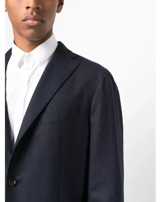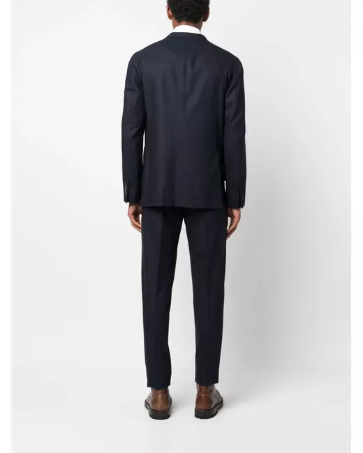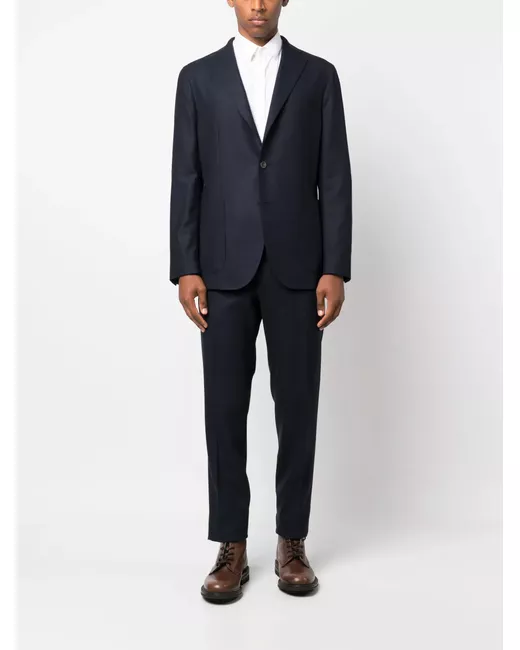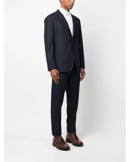 ink blue virgin wool Blazer: classic lapels front button fastening long sleeves chest welt pocket two front patch pockets Trousers: pressed crease mid-rise belt loops front button and zip fastening two side inset pockets two rear welt pockets