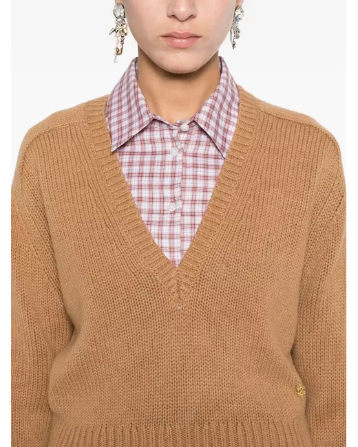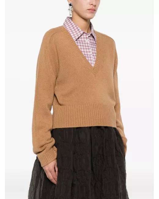 brown wool V-neck long sleeve ribbed hem and cuffs