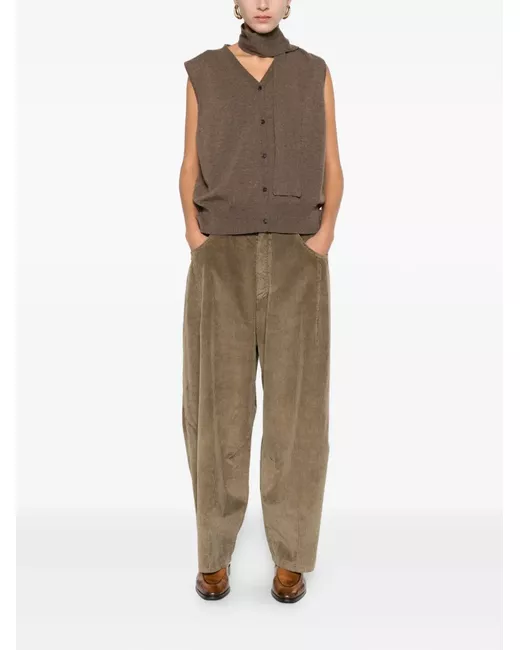 taupe brown merino wool v-neck front button fastening tie detail sleeveless