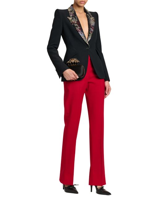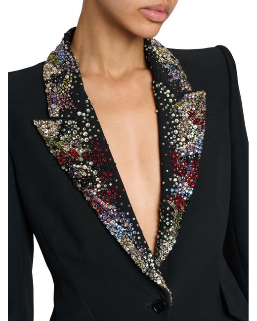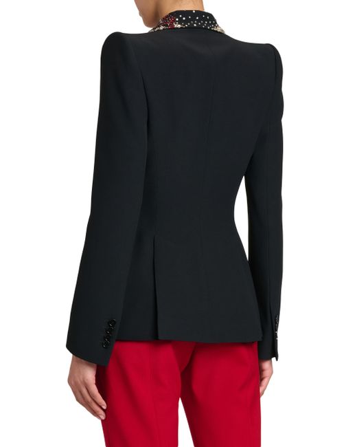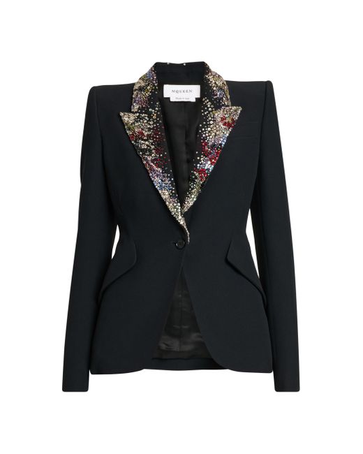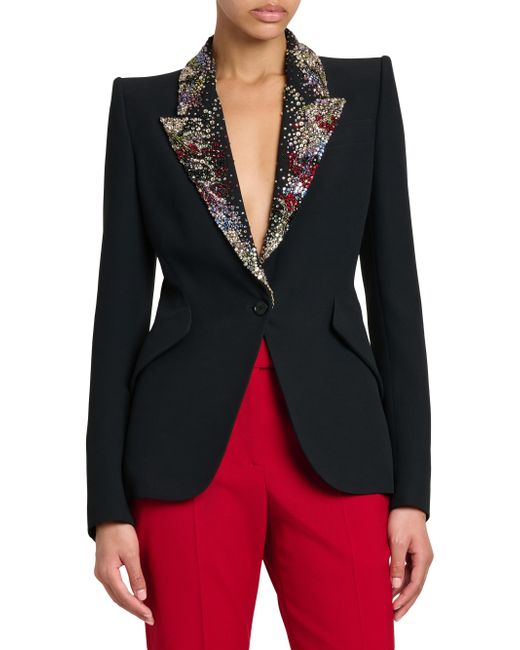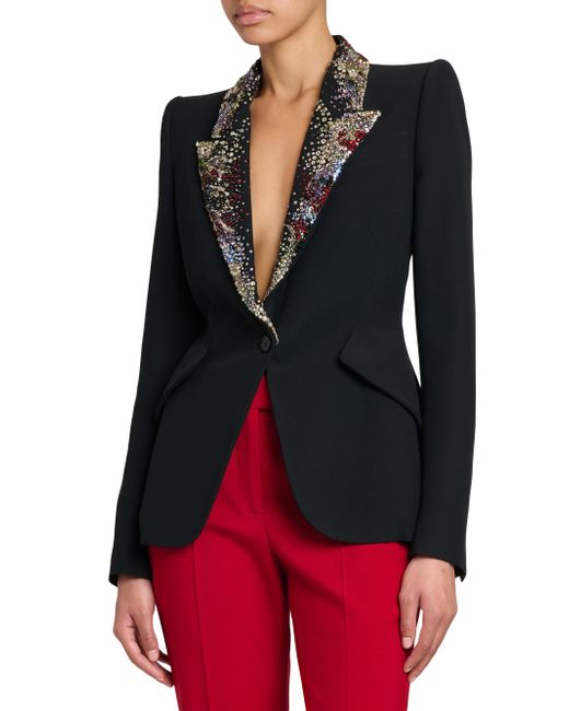Crafted of leaf crepe, this McQueen tailored blazer highlights the notch lapels with intricate crystal and bead embellishments. This piece features long sleeves with button cuffs, front flap pockets, and one-button closure. Notch lapels Padded shoulders Long sleeves, button cuffs Front flap pockets One-button closure 52% viscose/48% acetate Dry clean Made in Italy SIZE & FIT Model measurements: 5'10" tall Model is wearing a US size 4 ABOUT THE BRAND Visionary designer Lee Alexander McQueen launched his brand in 1992, which quickly became synonymous with cutting-edge, avant-garde design. Creative Director Seán McGirr has continued the designer's legacy, bringing precision craftsmanship and a feminine vision to the label's signature edge. Advanced European - Alexander Mcqueen > Mcqueen > Saks Fifth Avenue. McQueen. Color: Black. Size: 2.
